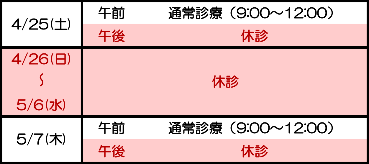 4月26日(日)から5月6日(水)まで休診とさせていただきます。
